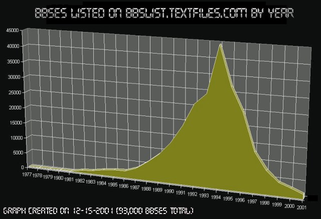 According to a graph created by the author of bbslist.textfiles.com, which contains the data for 93,000 BBS's up until 2001, the number of BBS's peaked in about 1994 with approximately 45,000 systems online. Contrast this with approximately 5,000 to 7,000 systems online in 1988-89 when I was running mine and only approximately 2,000 online in 2001. The number of BBS's online increased steeply from 1986 until 1994 and then decreased sharply with the increased usage of the Internet.
