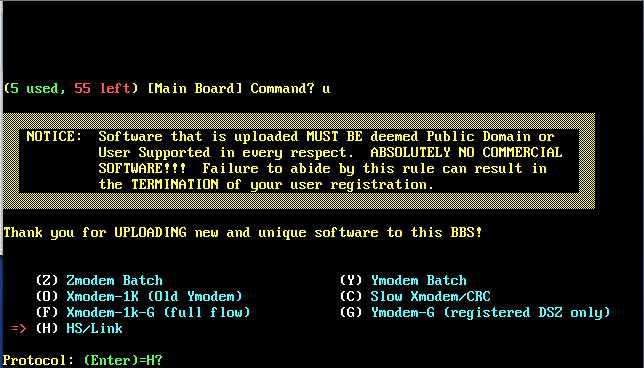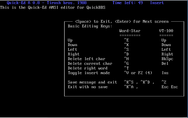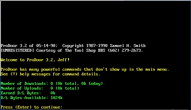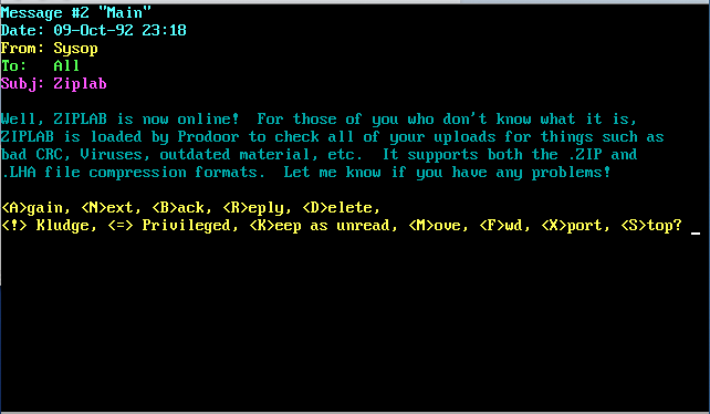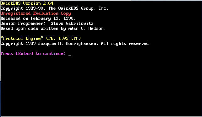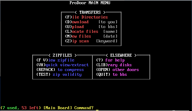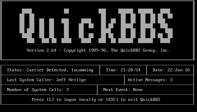 Over the next 3 years I would reconfigure the software, streamlining the menu structure quite a bit and adding a number of doors to the system. I would also prototype this new system using a newer version of QuickBBS...version 2.64. Other than for testing purposes, this new system would never go online and I would stop working on it in 1992. I have found a backup of this system though and was able to get screen captures of the BBS as it would appear online to the user. These images are available below. All ANSI menu screens were created with TheDraw, an ANSI drawing program.